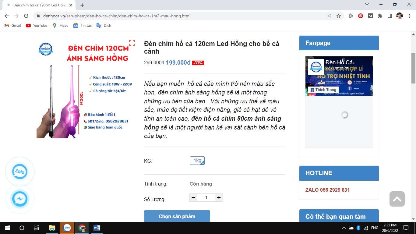 Mẫu đèn chìm hồ cá 120cm Led Hồng cho bể cá cảnh hiện đang là item bán chạy tại Đèn Hồ Cá, có giá bán ưu đãi 33% chỉ 199.000đ.