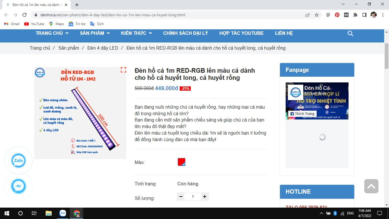 - Đèn hồ cá 1m RED-RGB lên màu cá dành cho hồ cá huyết long, cá huyết rồng: Đây là mẫu đèn tanning cá huyết long, huyết rồng, được làm từ chất liệu nhôm siêu bền được sơn cách điện chống rò rỉ điện, đảm bảo an toàn. Mẫu đèn này hiện đang sale 25%, giá chỉ còn 449.000đ (giá gốc 599.000đ).
